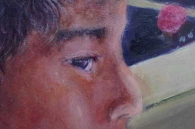 【2年生部長の油彩作品。目はまつげ1本1本まで筆で描いています。細部の表現もこだわっていますが、全体ではゲームセンターのゲーム機が放つ光の表現と奥行きを感じる空間の表現も魅力です。】