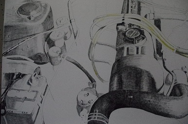 【2年デザインの作品。ボールペンでは表現できない細い線をペンにインクをつけて描いています。緻密な細い線の集合で立体感を表現しています。車のエンジンがスタイリッシュに描かれています。】