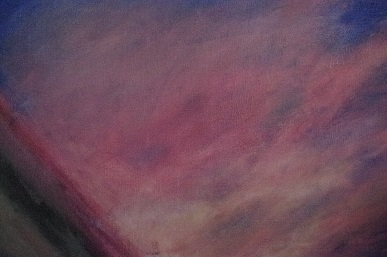 【1年生作品。学校から見えた印象的な空を描いています。重ねた油絵の具がきれいで、これからさらに雲を描いていきます。】