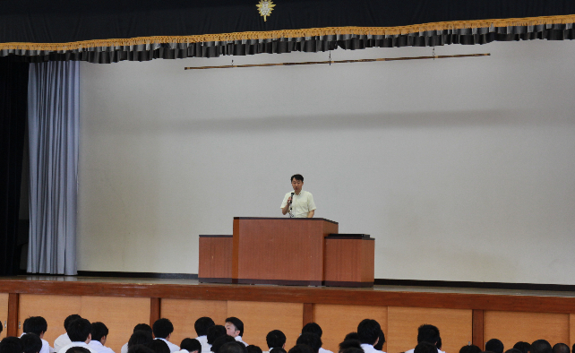 講話では、本校生が頑張っていることの話をされ、エンジントラブルの自動車を助けたことや近隣の火災を早期に発見し、消火活動をしたことなど人のために活躍したことを誇りに思うとのことでした。