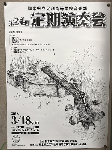 音楽部の定期演奏会のポスターを音楽部であり、美術部でも活動をしている部員が担当しました。緻密な線の集合による表現が魅力的です。難しい角度から楽器を描いています。周りの植物のそばにいる虫たちもかわいいです。