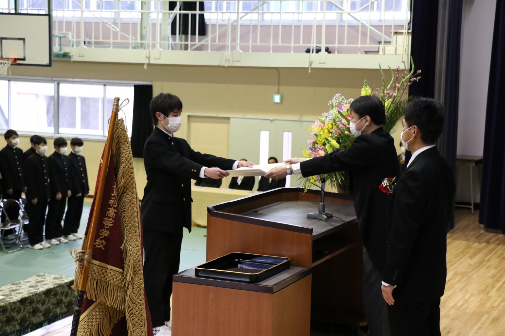 本日、第73回卒業式が挙行されました。今回も新型コロナウイルスによる感染症対策として、卒業生とその保護者、来賓には同窓会長様、PTA会長様のみをお招きし、開催しました。卒業生全員の呼名、校長式辞、卒業生代表あいさつと簡略化された形での実施でしたが、厳粛ですばらしい卒業式となりました。特に、卒業生代表あいさつでは、高校3年間の思い出や家族への感謝が語られ、参列者全員の胸が熱くなりました。