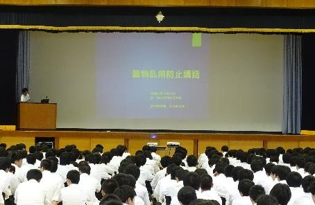 パワーポイントにて前半は違法薬物の危険性を、後半はスマートフォンによるネットトラブルの予防についてお話がありました。イラストや例えを交えての説明に、とても身近な危険性を感じました。薬物はとても危険なもので、絶対に使用してはいけないものだと改めて学びました。
