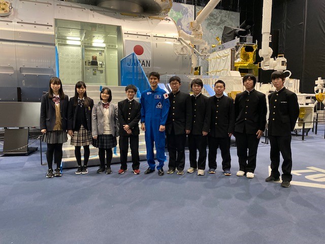 栃木県内のSSH実施校として本校・宇都宮女子高校・栃木高校より,2学年3名ずつの生徒が参加し,とちぎテレビ企画「日本の未来は『きぼう』で切り拓く(仮称)」の撮影が行われました。これは宇宙航空研究開発機構JAXAの事業内容を4回にわたって紹介するもので,JAXA職員の方が先生となり,その説明に対して生徒たちが質問や意見を述べたりしました。最後には宇宙飛行士の大西卓哉さんと対面し,質疑応答していただけるなど,とても貴重な経験をすることができました。