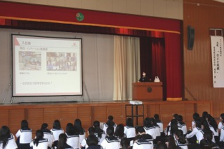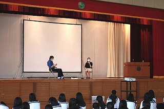 令和3年6月21日(月)に本校体育館において、キャリア教育講演会が行われました。本校卒業生で、現在、日本航空株式会社に勤務されている増田碧さんを講師にお迎えし、留学体験や大学生活、会社での取り組みについて講話を頂いた後、公民科の阿見先生との対談や質疑応答が行われました。3年生の後輩たちに向けて、“Seeing is Believing”をモットーにグローバルな人材を目指そうという力強いエールを頂きました。