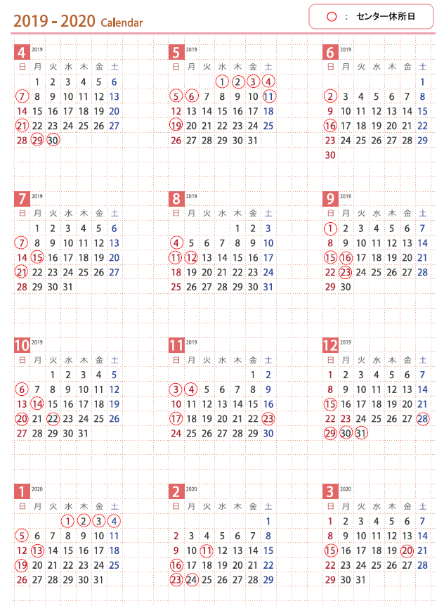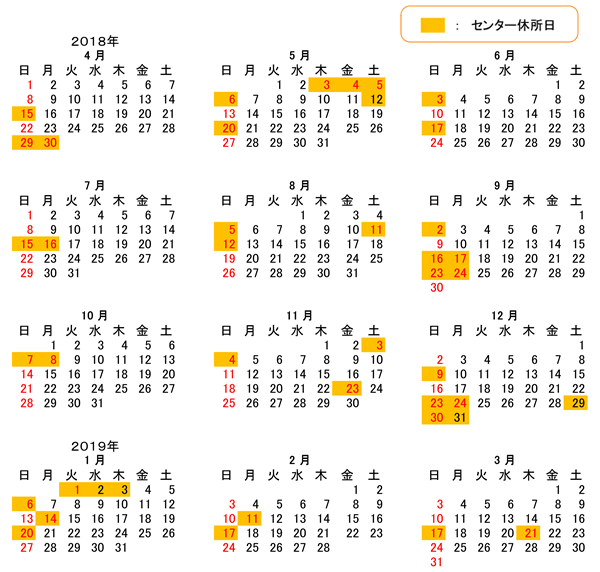 - 毎月第3日曜日、祝日、年末年始(12/28~翌年1/4)、臨時休所日は利用できません。