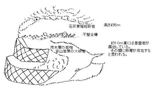 また、上位の凝灰質砂岩は那須塩原市(なすしおばらし)の荒川(あらかわ)沿岸に見られる荒川層群の基底にあたる地層です。