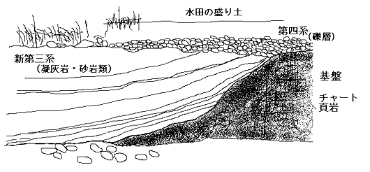 さらにそれらを覆う第四紀の礫岩層(れきがんそう)。