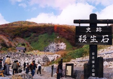 殺生石は、九尾の狐(きゅうびのきつね)が玉藻稲荷(たまもいなり)で討たれた後、その魂が那須に飛んで石になったと伝える石です。