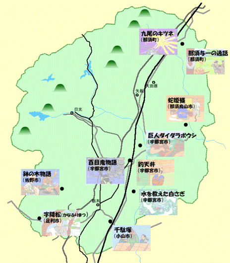 ・那須与一(なすのよいち)の逸話(いつわ)・九尾(きゅうび)のキツネ〔那須町(なすまち)〕 ・蛇姫様(へびひめさま)〔那須烏山市(なすからすやまし)〕・巨人ダイダラボウシ 〔宇都宮市(うつのみやし)〕・字降松(かなふりまつ)〔足利市(あしかがし)〕・釣天井(つりてんじょう)〔宇都宮(うつのみやし)〕・百目鬼物語(どうめきものがたり)〔宇都宮(うつのみやし)〕・水を教えた白さぎ〔上三川町(かみのかわまち)〕・千駄塚(せんだづか)〔小山(おやま)〕・鉢の木物語〔佐野市(さのし)〕