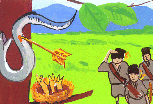 でも、本当は巣の中の雛を食べようとしていた蛇を狙って、見事に射抜いたという、幼少の頃から弓矢の技に秀でていたという話です。