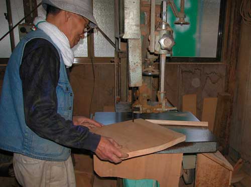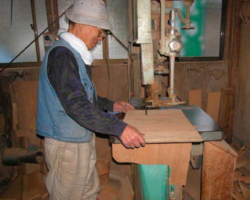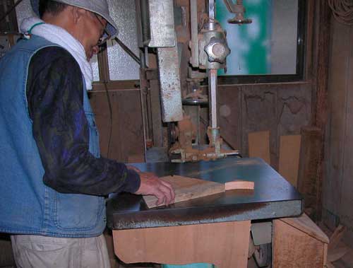 墨付け(すみつけ)した印に沿って、糸ノコギリ・帯ノコギリなどで慎重に切断します。