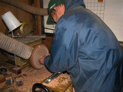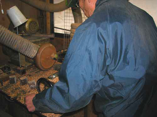 足踏み式ロクロ。足を踏みながら木地を回転させ、直接刃物であてていきます。