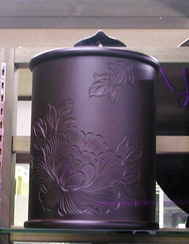 お弁当箱。ふたの部分に梅の花などが彫られています。