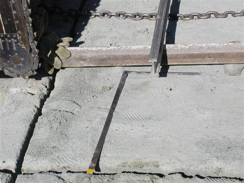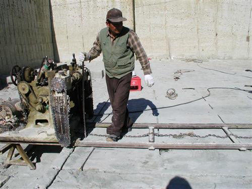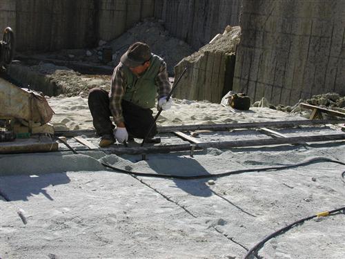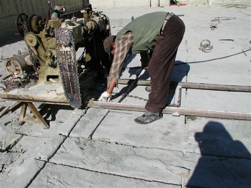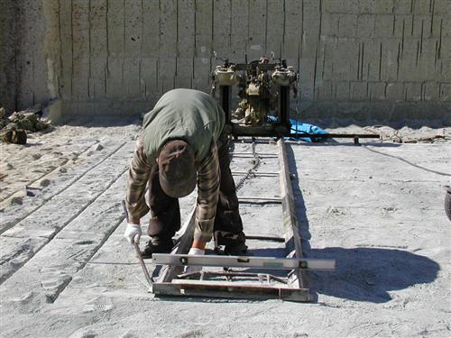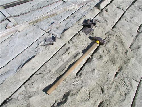 溝の間に「割り矢」を入れて、ハンマーで叩き、テコ棒で原石を地面からはがします。