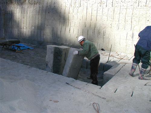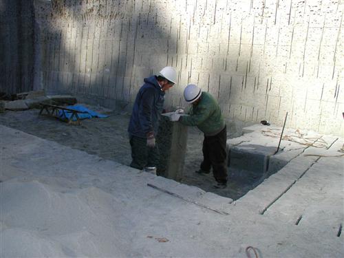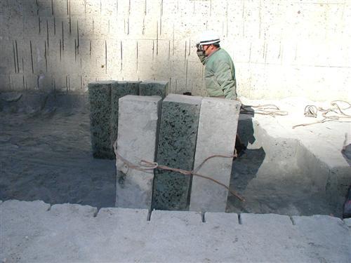 約32cm×39cm×95cmに切り出された原石の1本の重さは、水分をどれくらい含んでいるかにもよりますが、200kg以上あります。