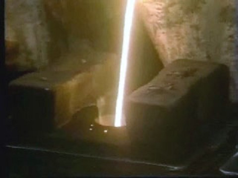 ルツボの中に地金を入れて溶解していきます。 燃料にはコークスと炭を使います。 湯口から溶かした金属を鋳型(いがた)に流し込みます。