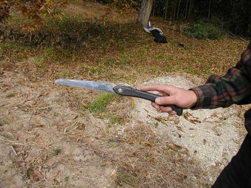 ノコギリ。切り出し、枝はらいに使います。