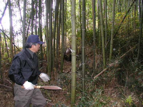切り出しをする3年目の竹には白いひもで印がつけてあります。