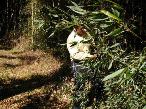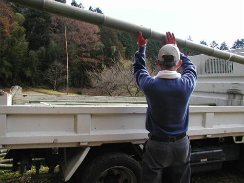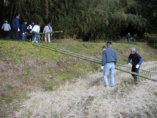 竹林から2~3人で竹を運び出します。