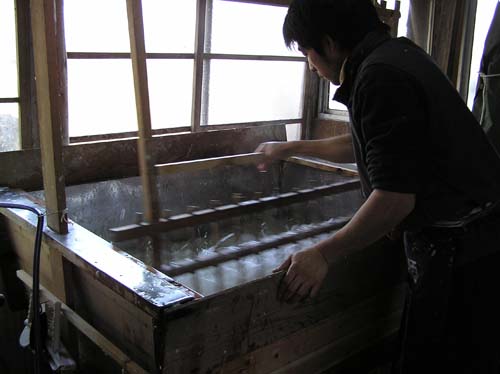 漉き船(すきぶね)と呼ばれる水槽に、叩きほぐされた繊維と水を入れます。
