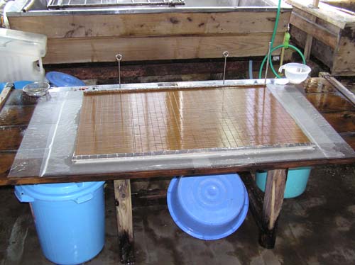 押し板の上に重ねられた漉いた紙です。上に乗っているのは漉き簀です。