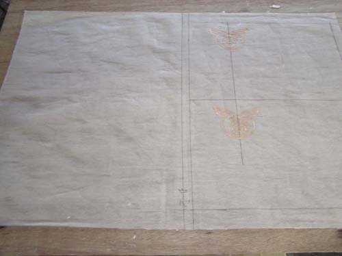 透かし模様を入れるために、漉き簀の上に模様入りの布をひきます。