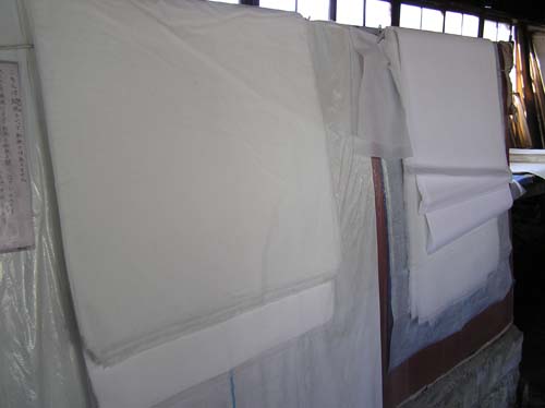 漉きあげられた和紙は漉桁からはずされ、押し板の上に一枚ずつ重ねられていきます。