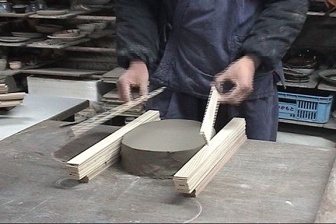 切りとった陶土は、型にのせて、はみ出した部分を切り取ります。