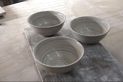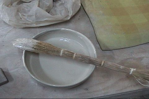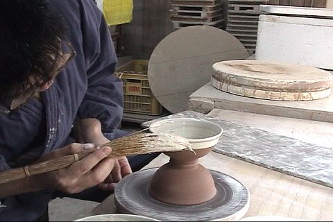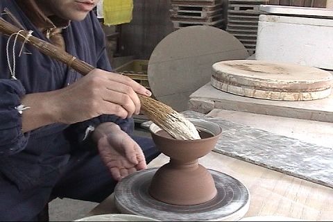 ろくろを回しながら、ミゴ刷毛で化粧泥を塗ります