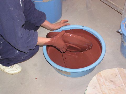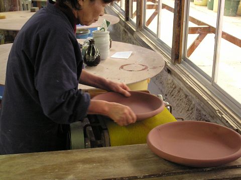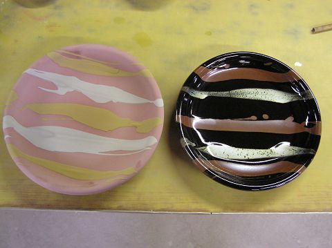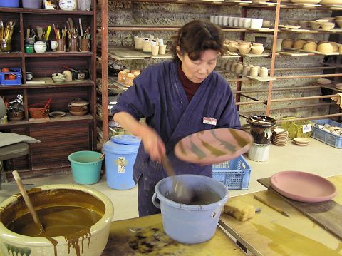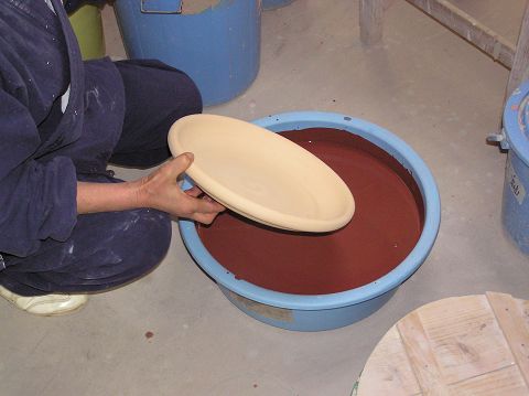 ひしゃくで釉薬(ゆうやく)を流して模様をつけます。 益子の代表的な手法です。