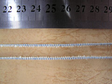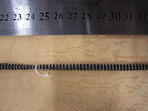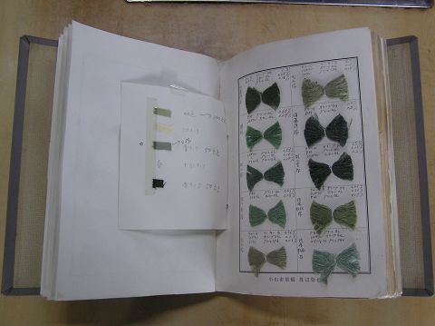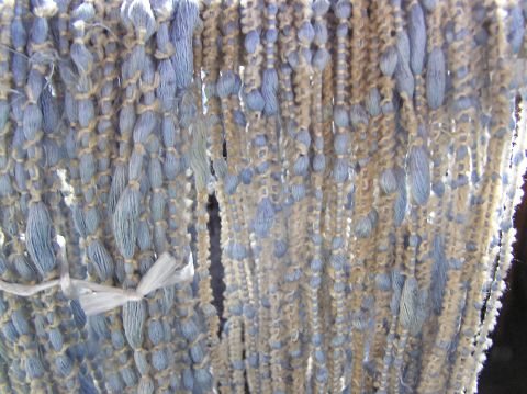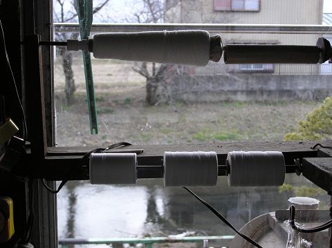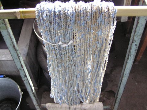 染まり具合を見るために、絣くくりの糸を取る事があるので、しばりなおす時のために糸が用意してあります