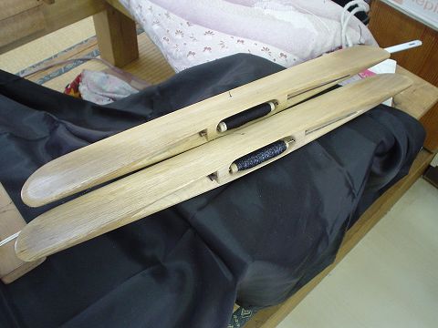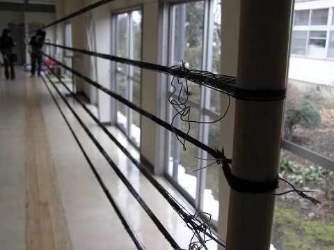 緯絣糸の工程です。 絣のできあがった緯糸は、一旦「薄糊付け(うすのりつけ)」をします。 広い場所で乾かしたあと「たいこ」と呼ばれる道具で巻き取ります。