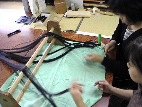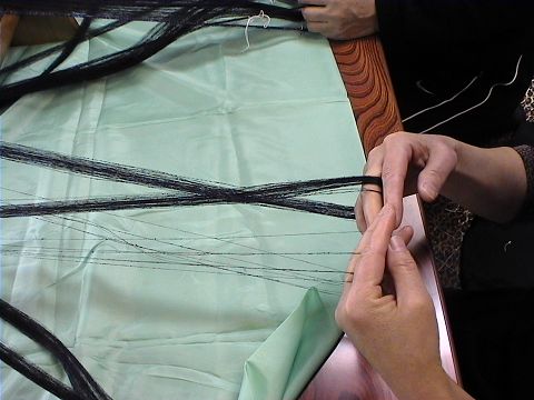 地糸と絣糸(かすりいと)が結ばれたら、図案にそって、絣糸を地糸の間に入れていきます。 2人1組で行います。