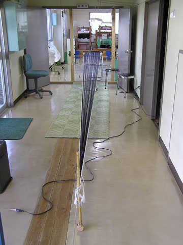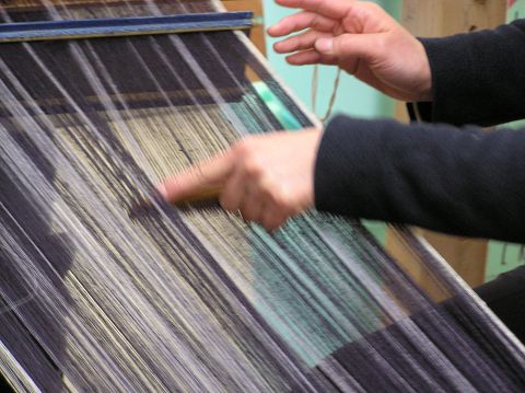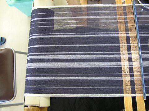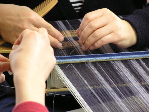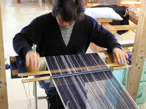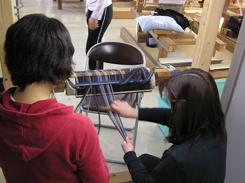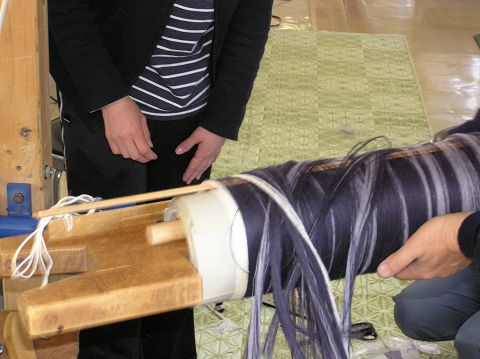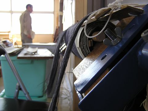緒巻(おまき)に経糸(たていと)を巻きます。 クシでとかしながら、まっすぐになるように丁寧に巻きます。 巻き終わったら、機織機にかけます。