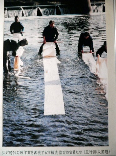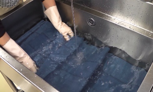 加工しやすくするためでもあり、製品した時に縮みを少なくするために行う工程です。 水につけ上下に動かしながら、振り洗いをし糊を落とします。 かつてこの作業は、真岡(もおか)の豊かな川の水を使って行われていました。