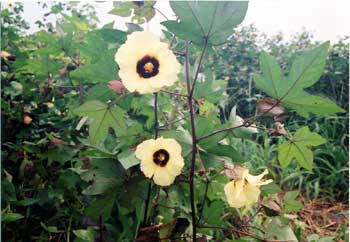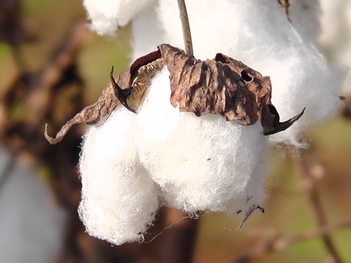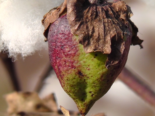 綿花は花が咲いてから5週間くらいすると実が熟し(卵形)、はじけて綿毛に包まれた種子を外に吹き出します。