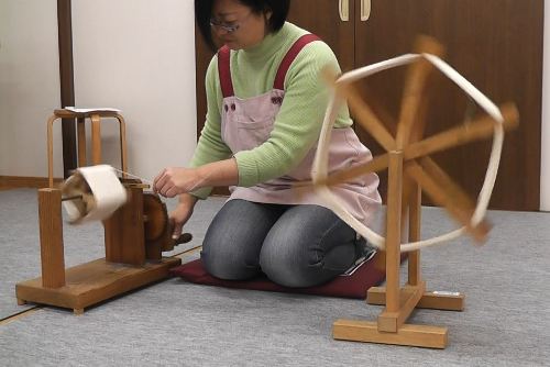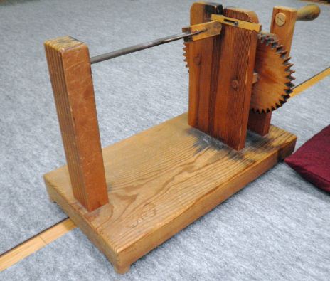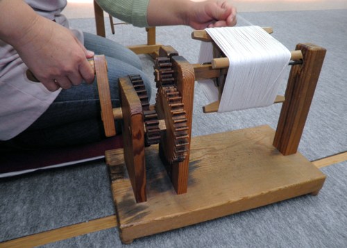 座操のハンドルを廻し糸を木枠に巻きつけます。