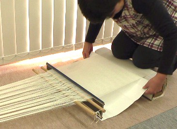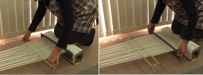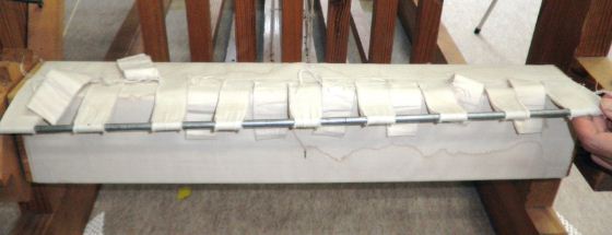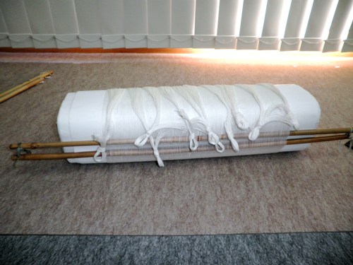 鉄棒部分に粗筬通し(あらおさとおし)した糸を結びつけます。
