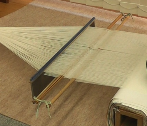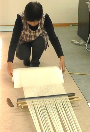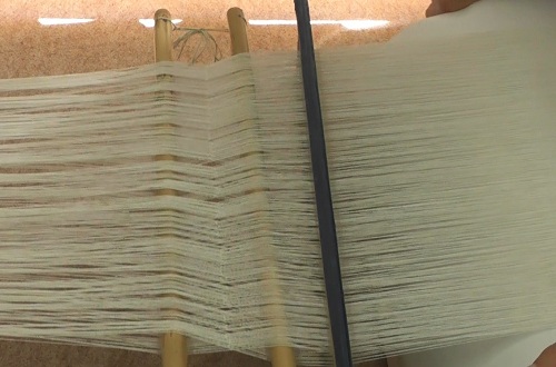 粗筬通し(あらおさとおし)された糸を巻き取っていく工程です。