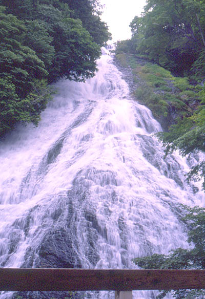三岳溶岩流(みつだけようがんりゅう)で堰止め(せきとめ)られた湯の湖から流れ落ちる滝です。
