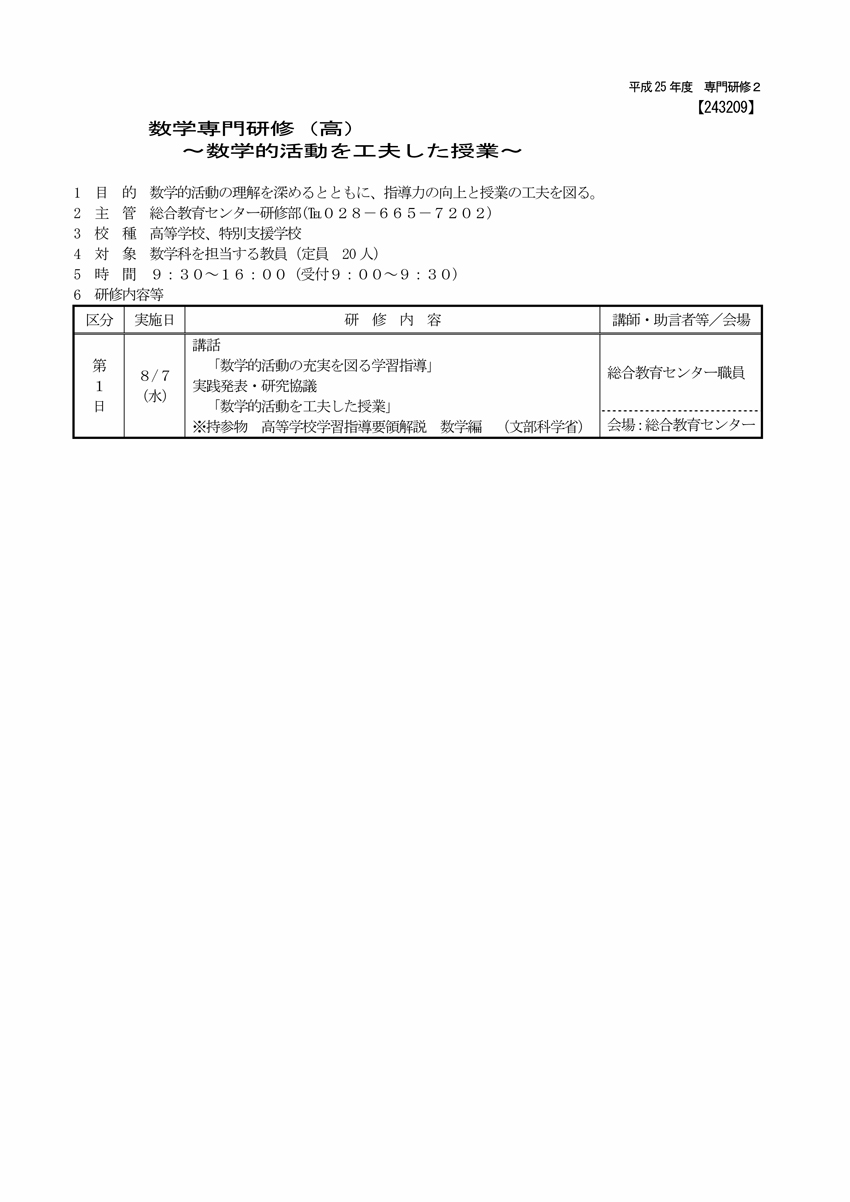 若手教員を中心に研修を行い、特に午後に演習した「数学的活動の取組を工夫した授業」が好評でした。学校では一人で授業を考えることが多いですが、この研修をきっかけに教科打合せ等で授業を一緒に考える機会を増やしてほしいです。数学科の目標を実現するためには、ただ「数学を学習すればよい」ということではなく、学習の仕方や質を改善していく必要があります。「数学的活動の充実が、数学の目標達成に向けて欠かせないものである」との認識が多くの実践で再確認されることを期待したいです。みなさん、これからも生徒のために教科指導を頑張ってください。
