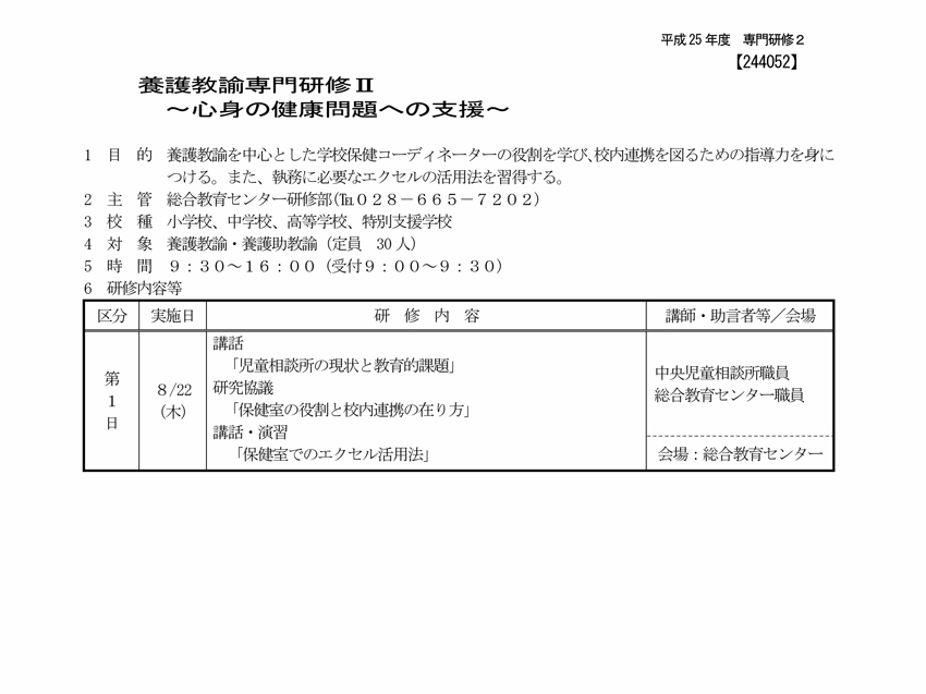 研修内容 | 1 講話「児童相談所の現状と教育的課題」 2 研究協議「保健室の役割と校内連携の在り方」 3 講話・演習「保健室でのエクセル活用法」