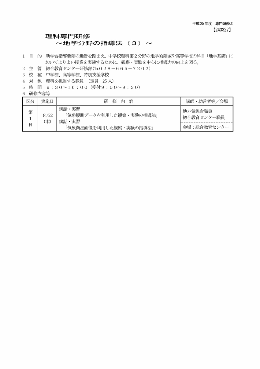 研修内容 | 1 講話・実習「気象観測データや気象衛星画像を利用した観察・実験の指導法」 2 研究協議・発表「気象観測データや気象衛星画像を利用した観察・実験の指導法」