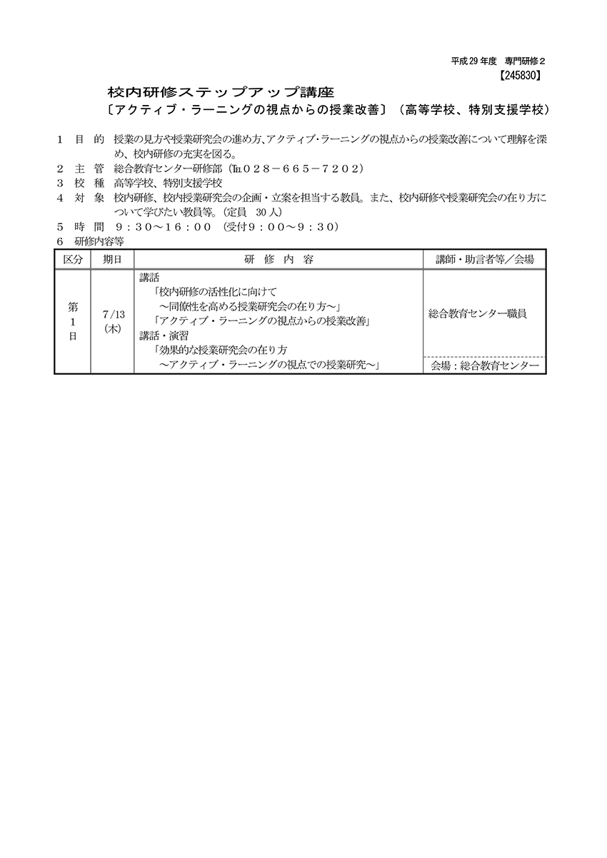 平成29年度 校内研修ステップアップ講座〔ALの視点からの授業研究〕(高・特)