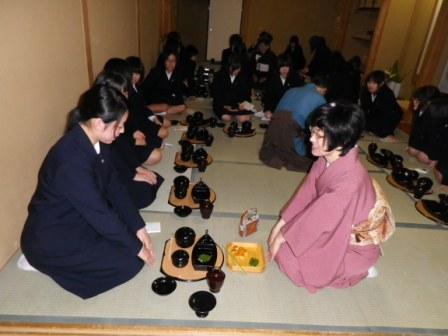 11月7日(水)総合家庭科3年生を対象に、料亭「明治屋」にて懐石料理のマナー講習会が行われました。講師は、大日本茶道学会教授 坂本智仙氏で、「伝統文化茶道」についての講義と「懐石料理のマナー」の実習がありました。 寄り付きで香煎をいただき、お席入りし、茶事が開始されました。この日の茶事懐石の献立は、折敷(飯 汁 向附 )、盃台、飯器、汁替、煮物椀、焼物、飯器、強肴、小吸物、八寸、湯桶、香の物で、季節感あふれるものを、礼儀作法を学びながら美味しくいただきました。ゆったりとした時間のなかで、お茶の精神である「和敬清寂」に触れることができ、有意義な講習でした。