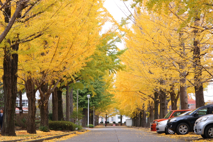 校門の季節感あふれる看板 本日の銀杏並木