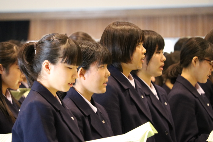 さらに、今年度、生徒会役員や有志生徒たちが忙しい合間を縫って創り上げた愛唱歌「道しるべ」を全校生徒で合唱しました。