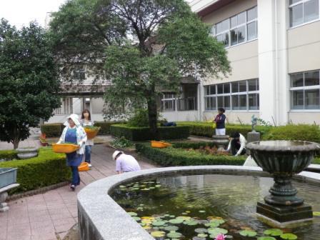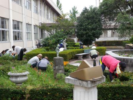 8月9日(土)午前10時から、PTA生活委員会の主催で、西洋式庭園(通称フランス庭園)の除草が行われました。