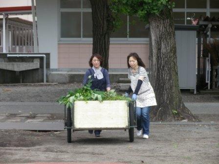 抜き取られた草は、次々とリヤカーで校庭北側の草捨て場へ運ばれました。
